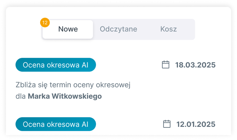 Ocena Okresowa AI to narzędzie, które łączy jasne kryteria, punktację i pełną historię zaangażowania pracownika w jednym miejscu. AI przygotowuje podsumowanie i rekomendacje, a menedżer ma zawsze kontrolę nad finalną oceną.