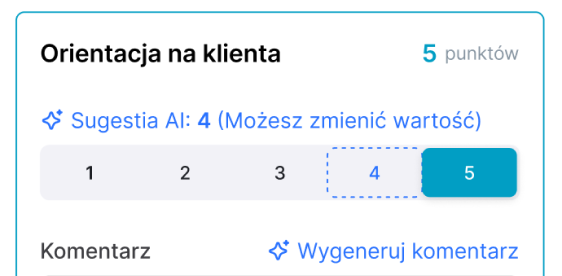 Rola AI w module Ocena Okresowa polega na wsparciu menedżera w procesie podejmowania decyzji. System analizuje zebrane dane o zachowaniach, inicjatywach i zaangażowaniu pracownika, a następnie tworzy podsumowanie oraz rekomendacje oceny. Dzięki temu menedżer oszczędza czas, zyskując przejrzysty obraz kluczowych informacji. AI nie zastępuje jednak człowieka – finalna decyzja i możliwość edycji zawsze należą do menedżera. To połączenie automatyzacji i ludzkiej perspektywy gwarantuje obiektywność oraz bezpieczeństwo procesu oceny.