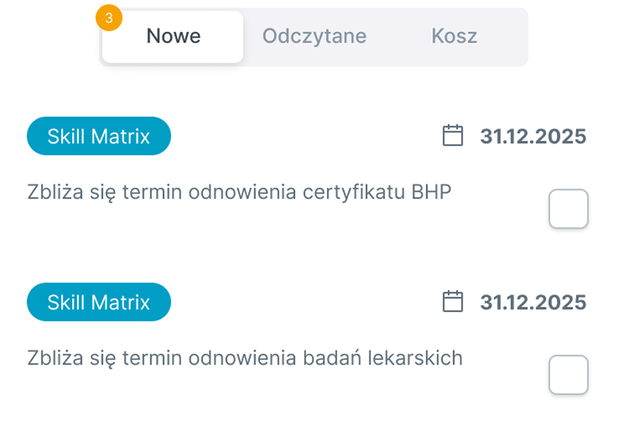 Przypomnienia o konieczności odnowienia certyfikatu, szkolenia czy ponownej weryfikacji umiejętności.