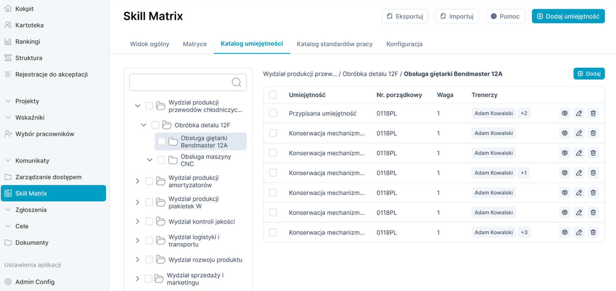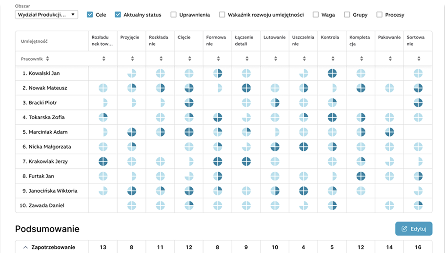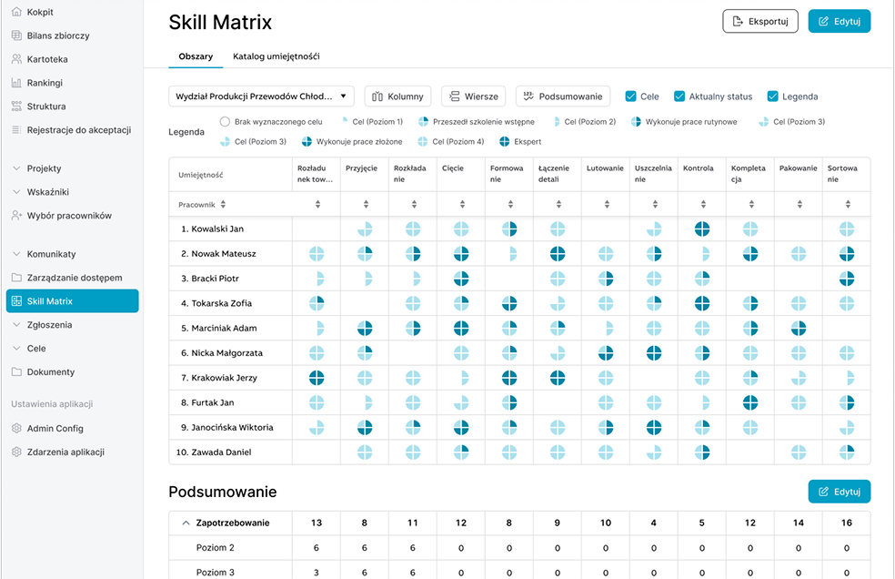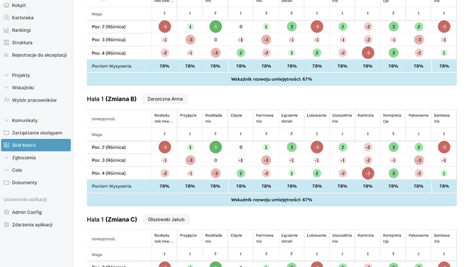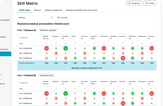 Jednoznaczne oznaczenia poziomu umiejętności pracownika, dzięki którym każdy — od operatora po kierownika — natychmiast widzi, kto co potrafi i na jakim jest etapie rozwoju.